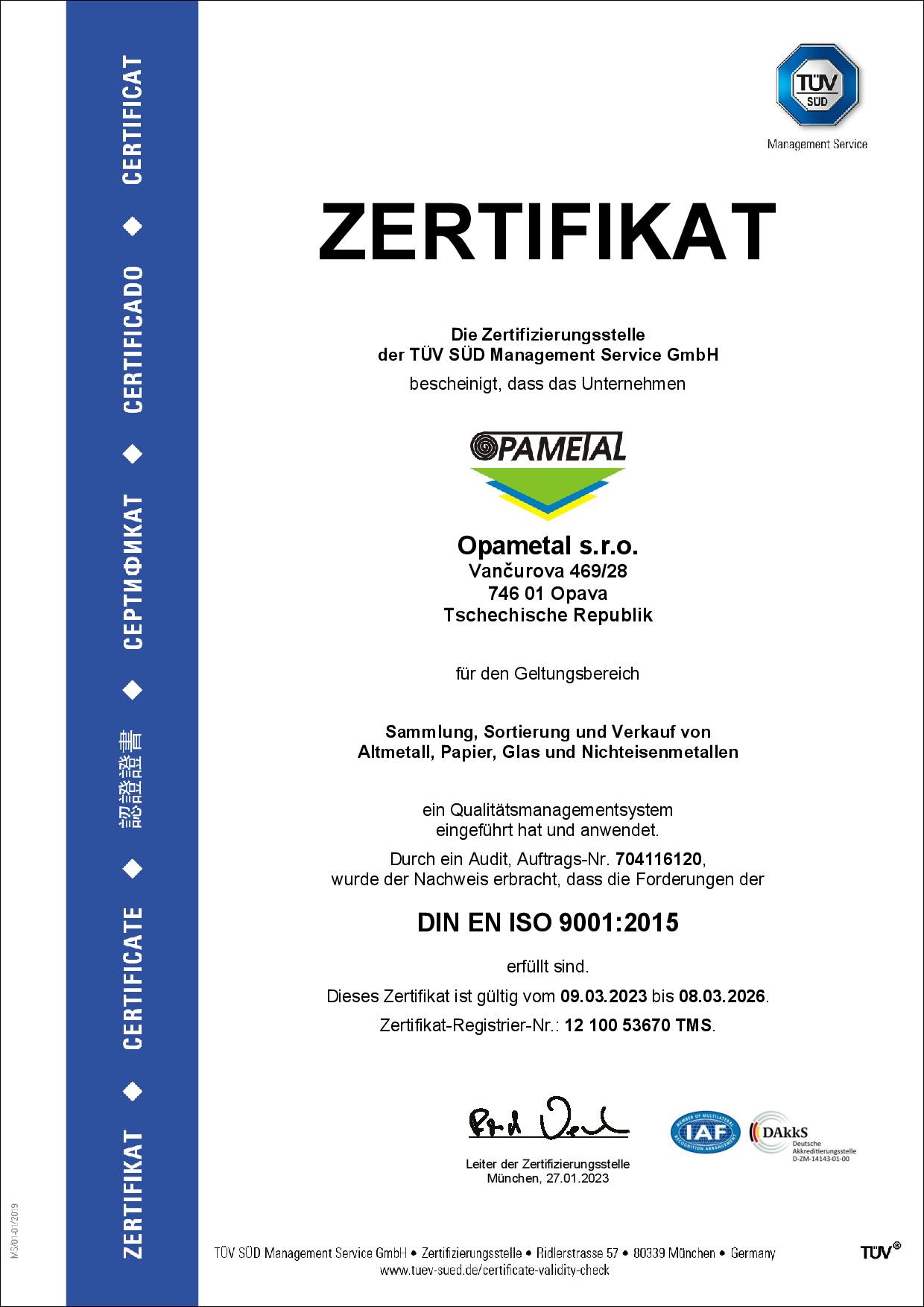 Od roku 2015 jsme držiteli certifikátu ISO 9001: Systém řízení jakosti v oboru sběru, třídění a prodeje kovového odpadu, papíru, odpadů barevných kovů a skladu.